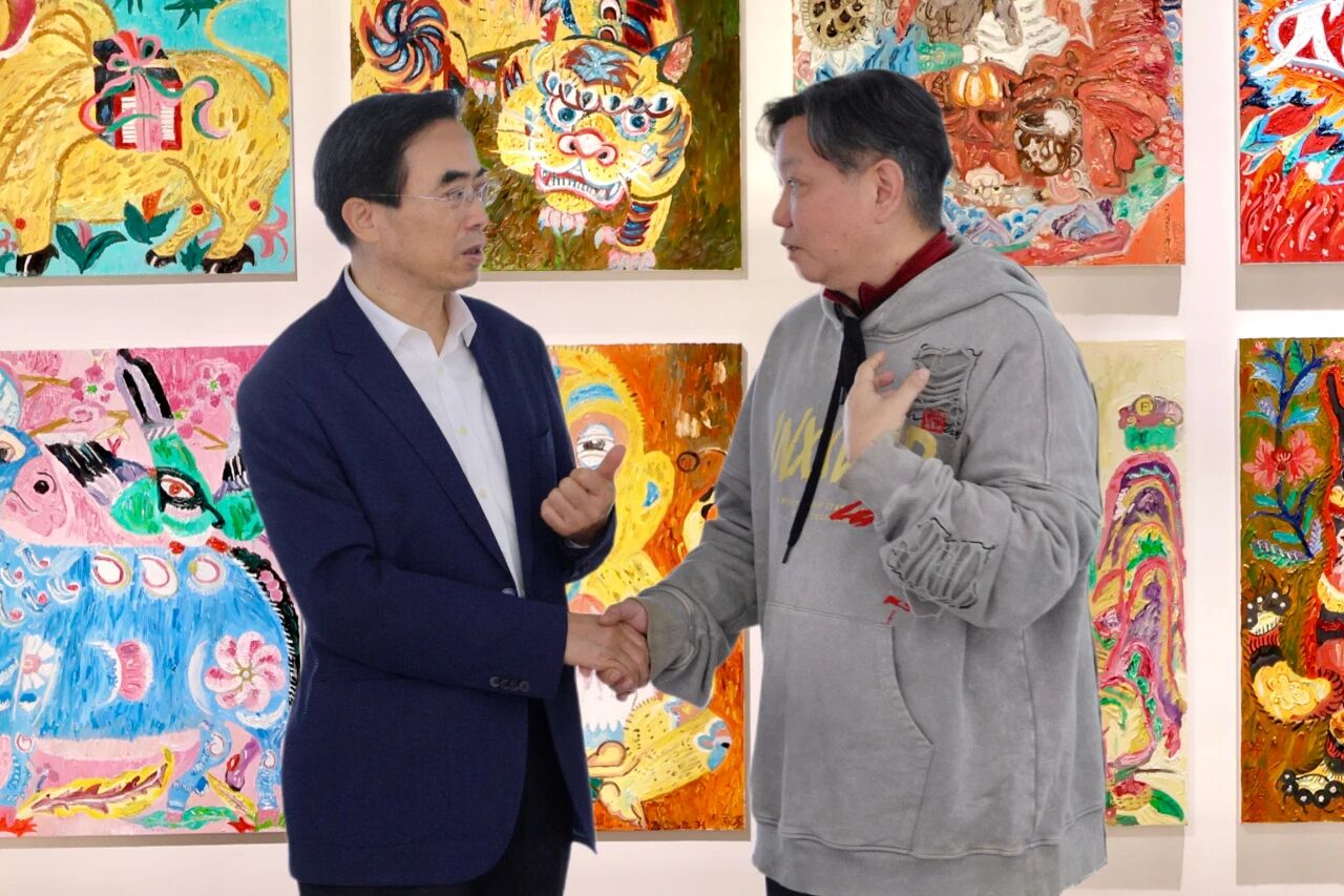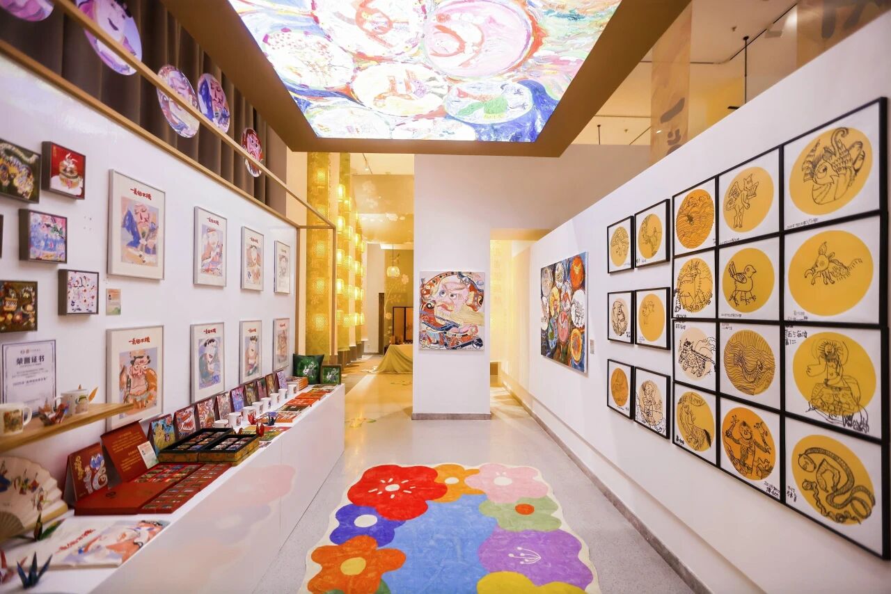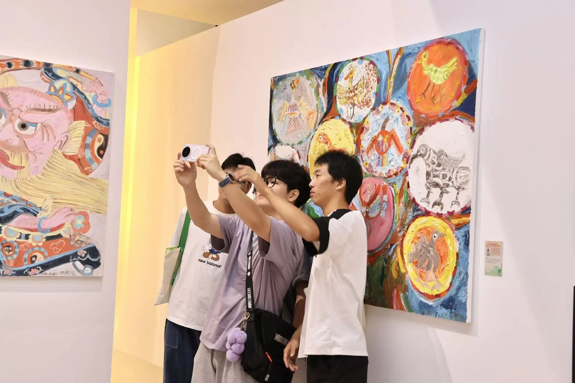 在“一万个太阳”展区,一幅幅色彩热烈、充满奇思妙想的画作深深吸引着前来参观的人。这些根植于良渚、汉画、敦煌、三星堆等中华文明母题的作品,不仅展现了深厚的文化底蕴,更传递出创作者纯净而强大的内心世界。