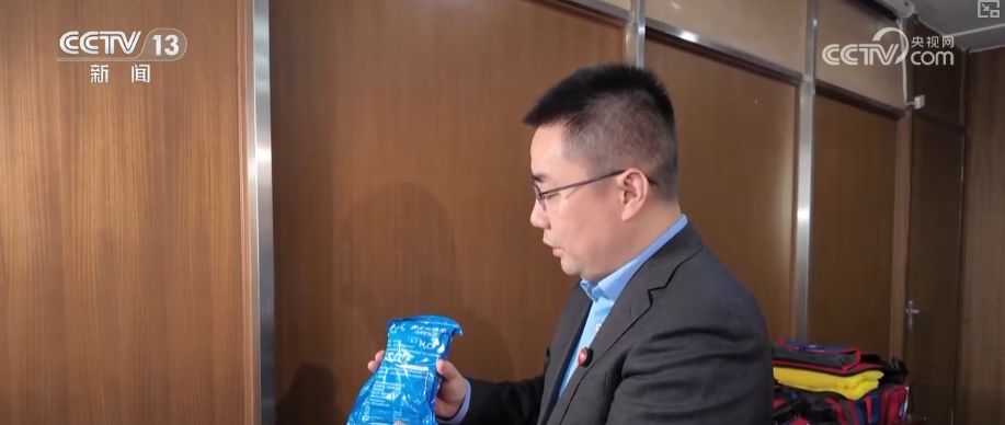 秦挺鑫表示,在食品这一块,主要有救生的饮用水。之所以用这个包装,是由于这个包装它的保质期会比较长,可以达到3年。另外,还配备了压缩饼干,一包饼干的能量就够一个人维持一天的能量。还有一个急救包,有创可贴、碘伏、温度计、绷带,棉签等常见的一些急救用品。