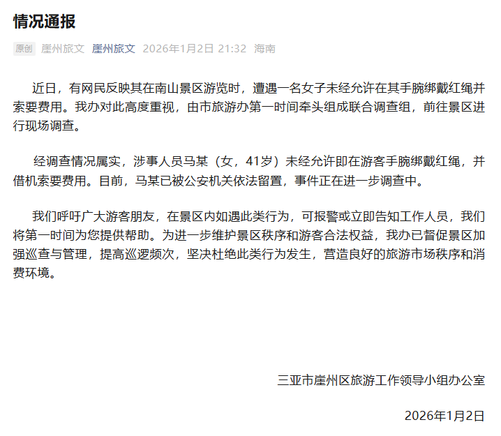 央视网消息:1月2日,海南省三亚市崖州区旅游工作领导小组办公室发布情况通报:近日,有网民反映其在南山景区游览时,遭遇一名女子未经允许在其手腕绑戴红绳并索要费用。我办对此高度重视,由市旅游办第一时间牵头组成联合调查组,前往景区进行现场调查。