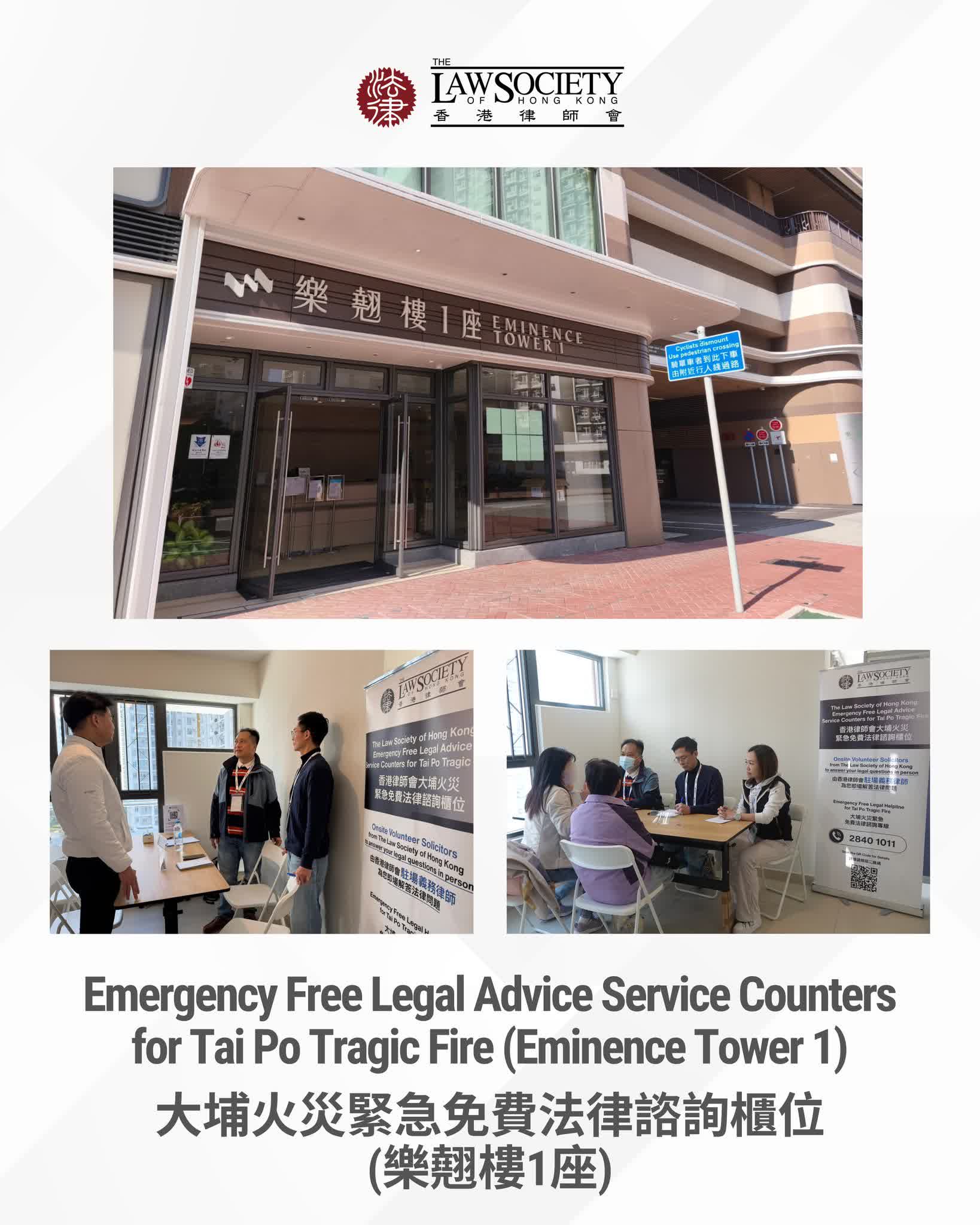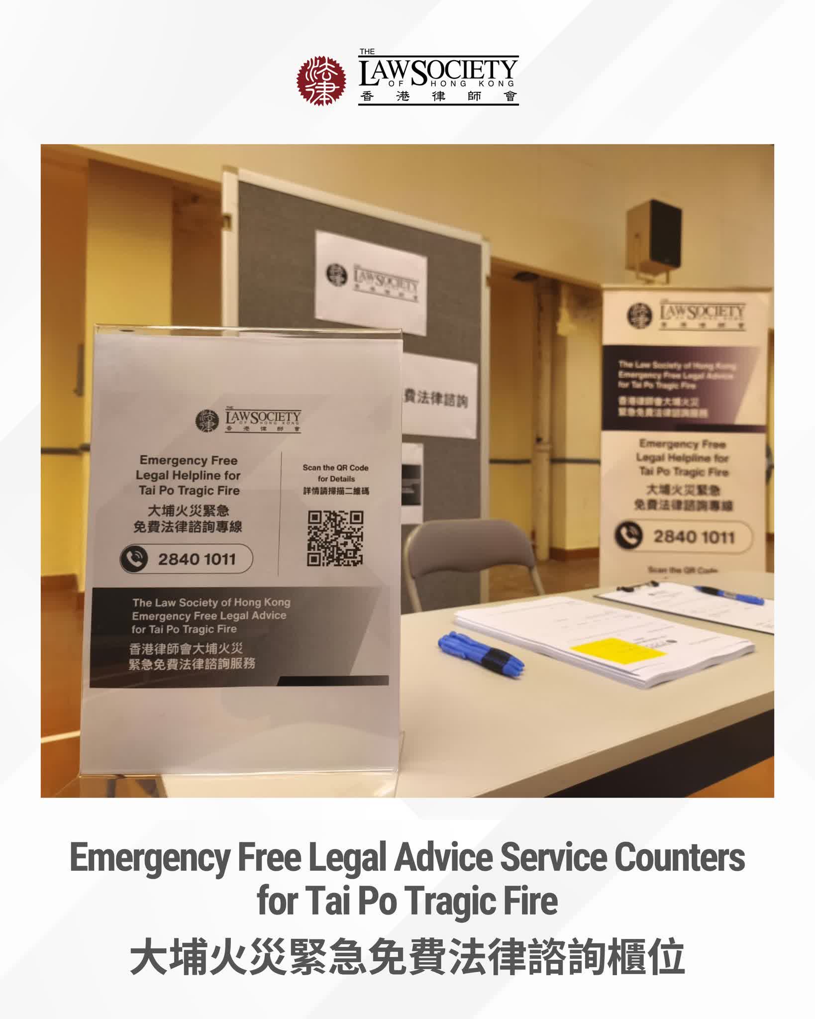 香港文匯報訊(記者 蕭景源)香港律師會一直致力以法律專業和關懷服務社會,該會今日(3日)在其社交平台表示,自上月起,律師會已在香港不同地區設立了6個緊急免費法律諮詢服務櫃位,為受大埔火災影響的居民提供及時和專業的法律支援。今天律師會在洪水橋樂翹樓1座增設多一個服務櫃位,令服務櫃位總數擴充至7個。
