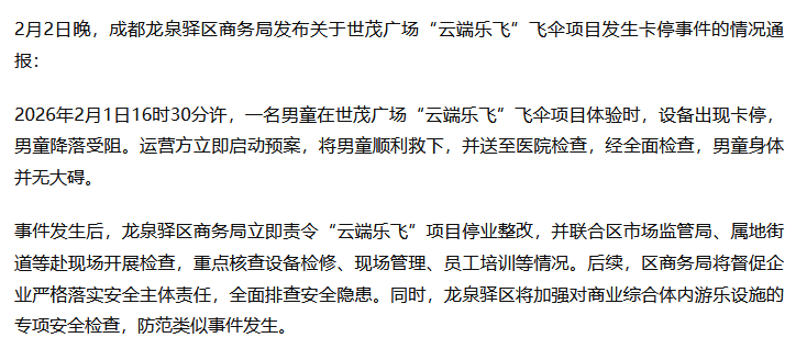 ·成都通报一商场有儿童被大气球悬吊空中:飞伞项目设备故障,责令停业整改。