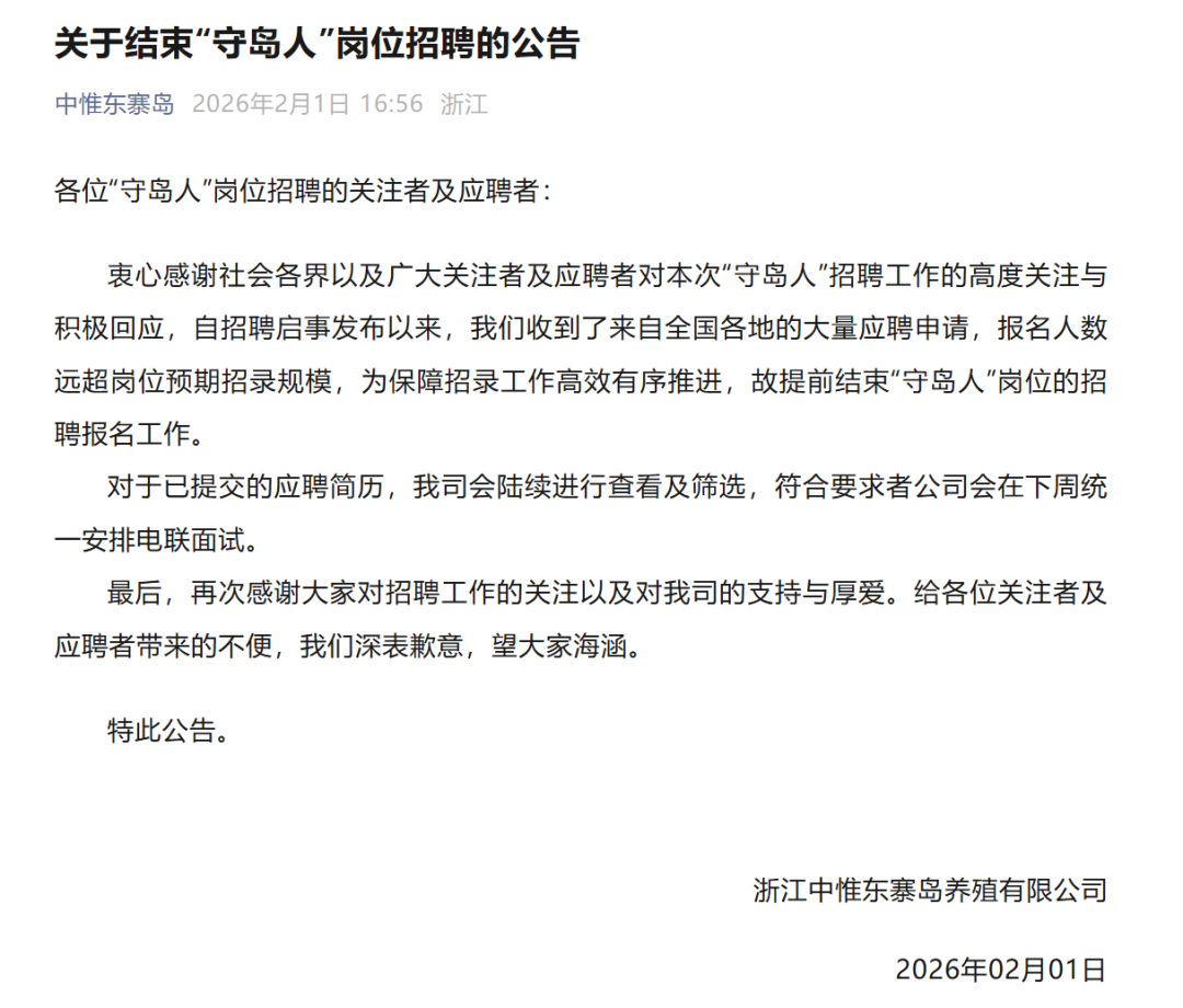 ·应聘人数太多远超预期,浙江舟山“守岛人”招聘提前结束,公司回应“炒作质疑”:不存在炒作,属于真实招工。