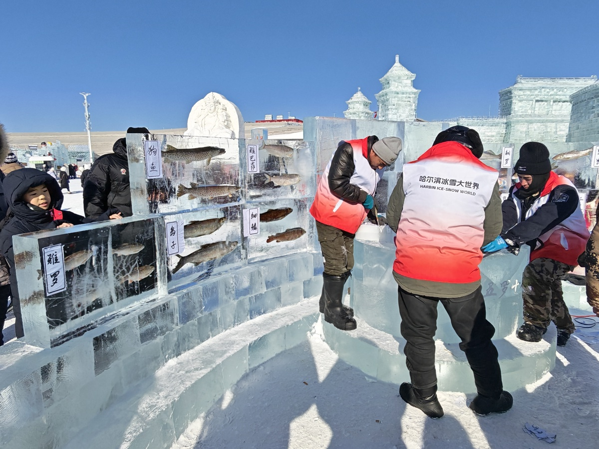 ·哈尔滨冰雪大世界上新:“三花五罗十八子”鱼冰雕惊艳亮相,含10个特色鱼种共50余条,寓意“年年有余”。