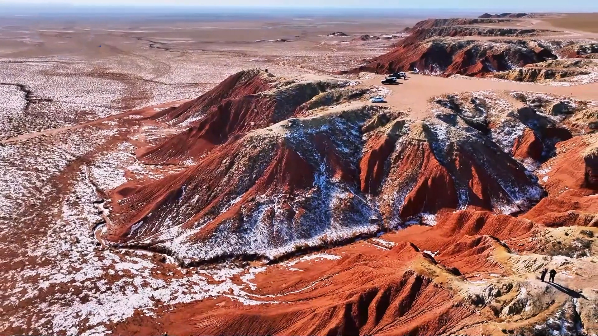 在内蒙古乌兰察布市四子王旗,初春的大红山覆盖薄雪,红色山体与积雪交错。从空中俯瞰,地貌连绵起伏,雪覆丹霞,展现出初春时节冰雪未消的自然景象。