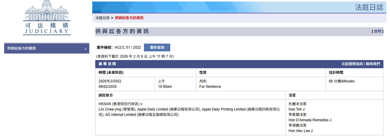 司法機構網站今日(6日)顯示,「黎智英案」被告黎智英以及8名認罪被告,將於下周一(2月9日)上午10時判刑。《香港國安法》列明,「串謀勾結外國勢力」罪最高刑罰為終身監禁。