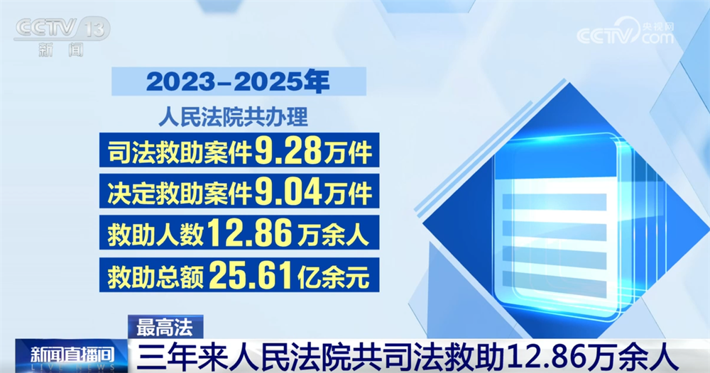 央视网消息:2月6日,最高人民法院召开新闻发布会,介绍国家司法救助工作有关情况。三年来,人民法院共司法救助12.86万余人,救助总额25.61亿余元。