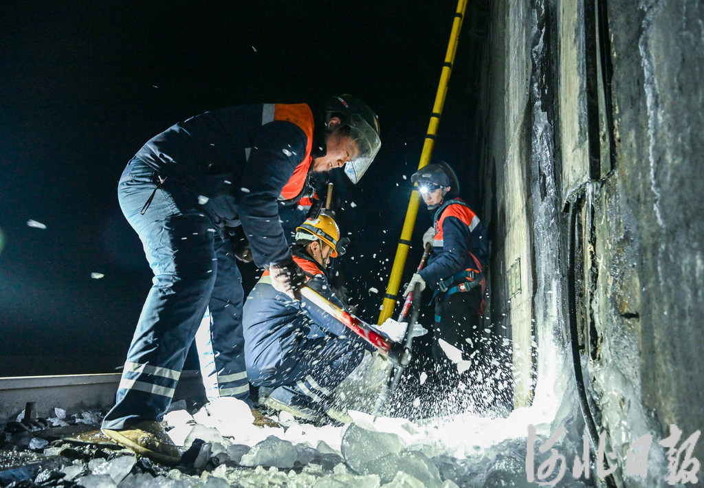 2月3日,王鸿霖(左一)和同事在丁庄隧道内除冰。河北日报记者李东宇摄