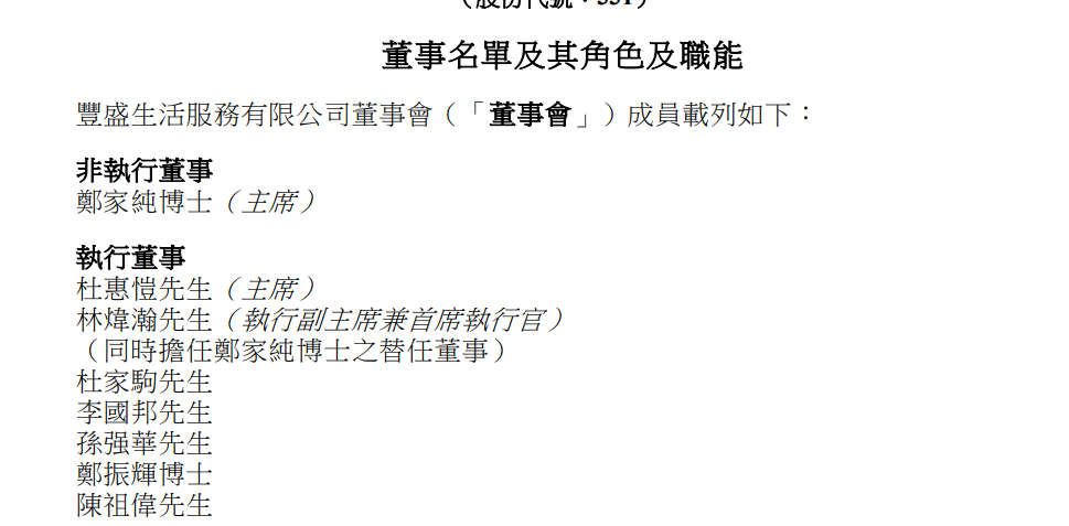 公开资料显示,丰盛生活服务董事会主席分别是郑家纯和杜惠恺。郑家纯为新世界发展、周大福创建及周大福珠宝主席兼执行董事;杜惠恺为新世界发展副主席兼非执行董事及上海实业独立非执行董事。郑家纯今年已79岁。