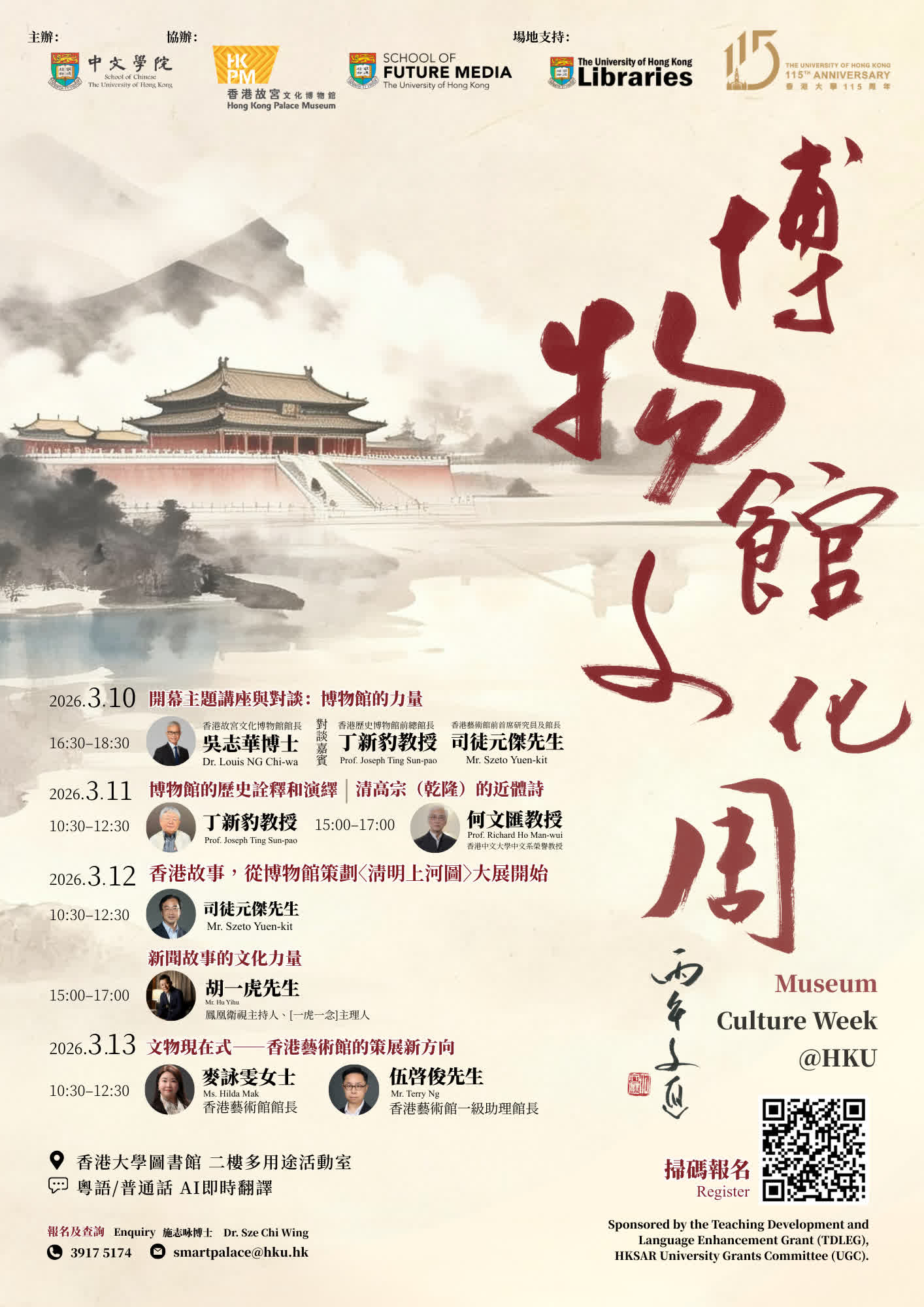 香港文匯報訊 3月10日至13日,香港大學中文學院將在大學教育資助委員會「語文教學發展發展基金」(TDLEG)的支持下,在香港大學圖書館二樓多用途活動室開展首屆「博物館文化周」系列活動。活動由香港故宮文化博物館及香港大學未來媒體學院協辦,結合國際級博物館的策展專業與新媒體科技的創新力量,探索AI時代的策展思維。此活動亦為香港大學115周年慶祝活動。