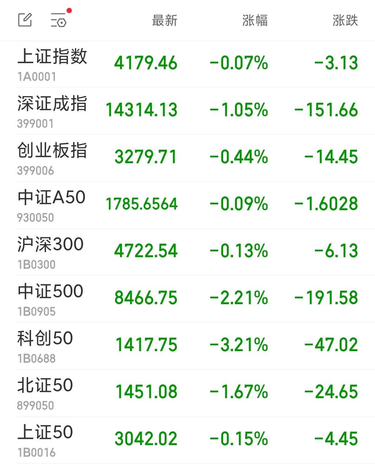 中新经纬3月3日电 周二早盘,A股三大指数高开低走。截至午间收盘,上证指数跌0.07%,报4179.46点;深证成指跌1.05%,报14314.13点;创业板指跌0.44%,报3279.71点。