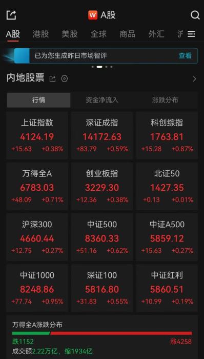 全市成交额2.22万亿,超4200只个股上涨。