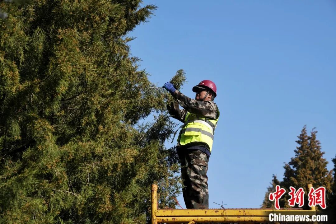 园林绿化工作人员在北京地坛公园修剪圆柏。中新社记者 张祥毅 摄