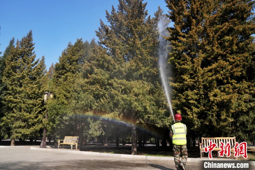 天坛公园注重错峰精细化作业。在游客量较少、花粉浓度较高的时段,组织绿化队与保洁人员对主干道两侧柏树开展高压清水喷淋,及时冲刷花枝花粉;每日开园前、闭园后,强化地面清扫与湿化作业。同时,充分启用草坪微喷系统提升空气湿度,抑制花粉悬浮扩散。各种作业同步开展游客疏导,播放温馨提示广播,减少对游园秩序的影响。