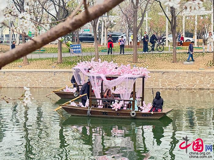 北小河及沿岸,粉白的樱花与娇艳的海棠交相辉映、灿若云霞。 摄影 中国网记者 苏向东