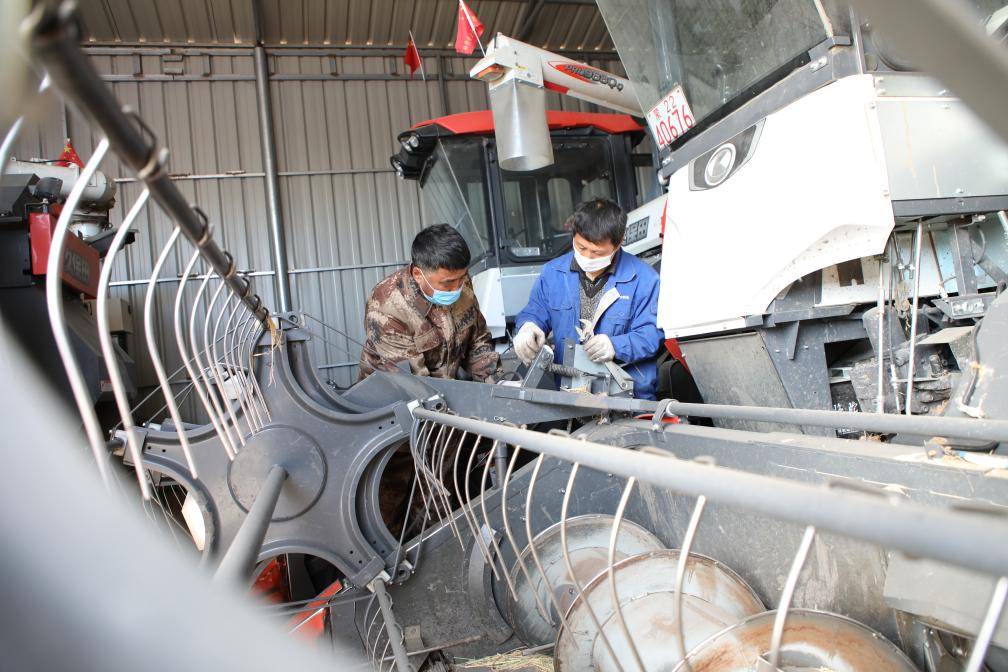 在科尔沁右翼前旗,工作人员正在检修农机。(时秀霞 摄)
