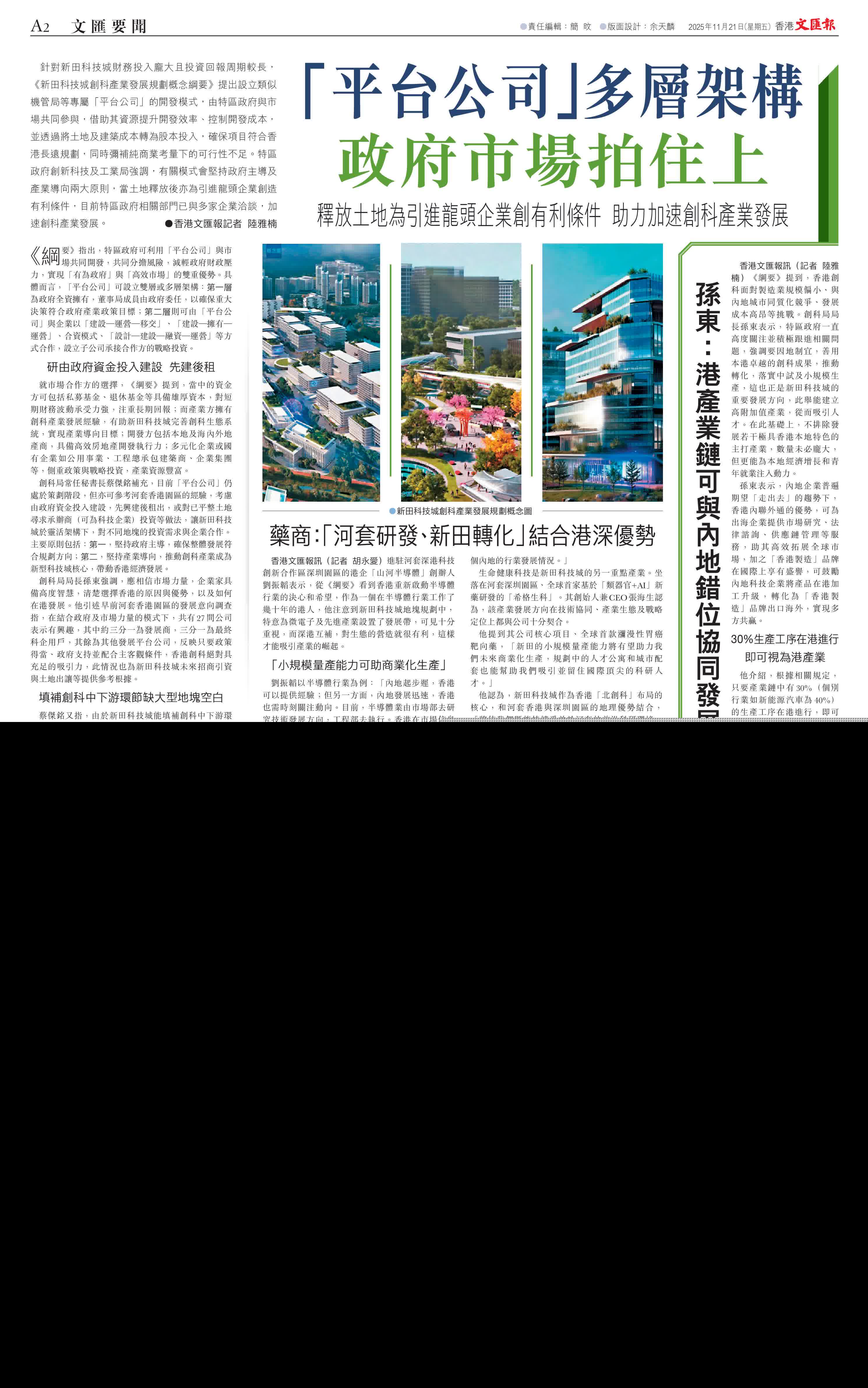 他認為,新田科技城作為香港「北創科」布局的核心,和河套香港與深圳園區的地理優勢結合,「將使我們既能持續受益於河套的前沿科研環境,又能充分利用新田的產業化優勢,有望實現『河套研發、新田轉化』的發展模式。」