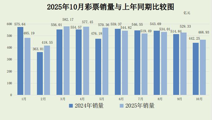 中国网11月24日讯 据财政部网站消息,财政部24日在其官网公布2025年10月份全国彩票销售情况。10月份,全国共销售彩票468.93亿元,同比增加26.68亿元,增长6.0%。1-10月累计,全国共销售彩票5230.30亿元,同比增加98.19亿元,增长1.9%。