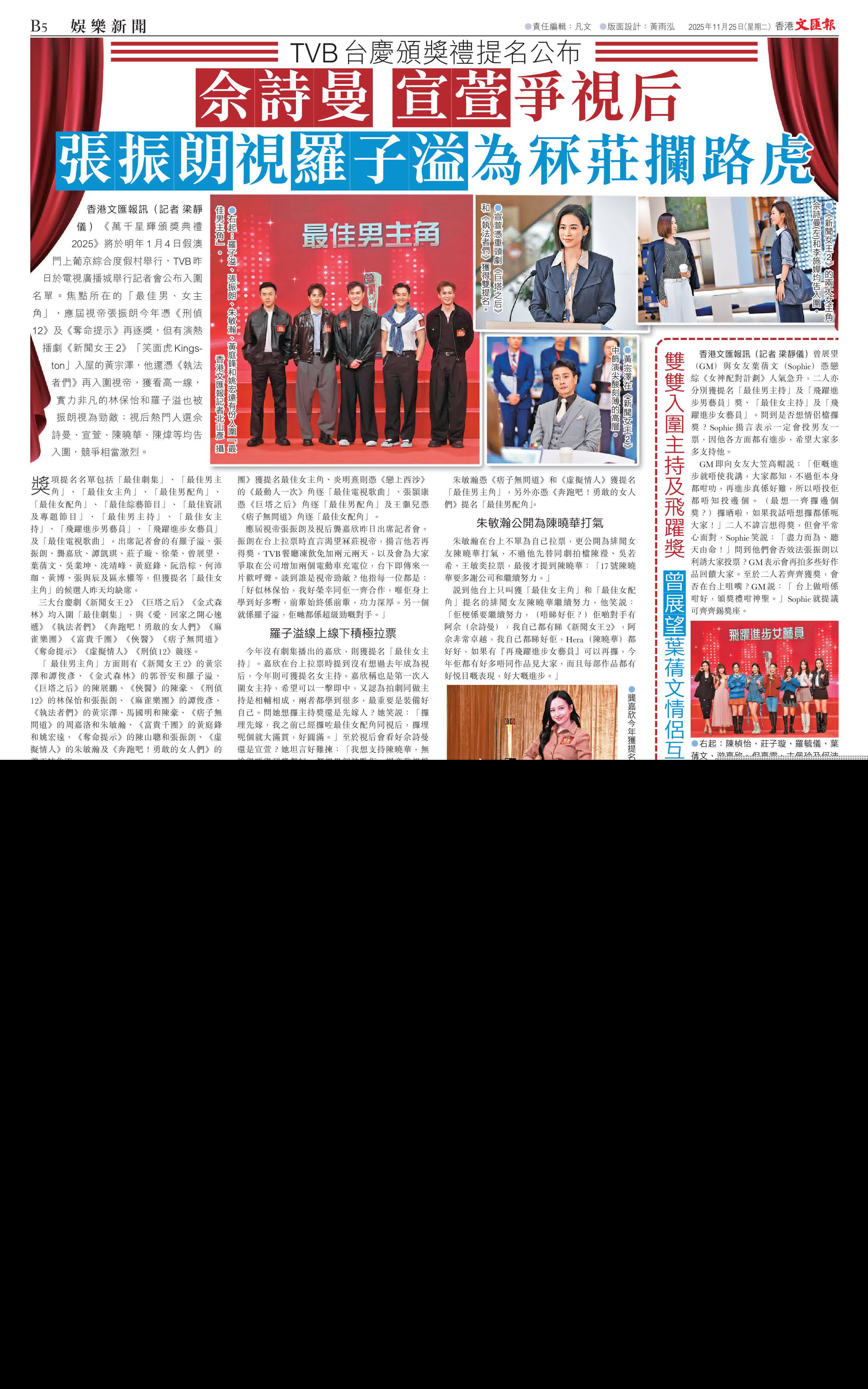 香港文匯報訊(記者 梁靜儀)《萬千星輝頒獎典禮2025》將於明年1月4日假澳門上葡京綜合度假村舉行,TVB昨日於電視廣播城舉行記者會公布入圍名單。焦點所在的「最佳男、女主角」,應屆視帝張振朗今年憑《刑偵12》及《奪命提示》再逐獎,但有演熱播劇《新聞女王2》「笑面虎Kingston」入屋的黃宗澤,他還憑《執法者們》再入圍視帝,獲看高一線,實力非凡的林保怡和羅子溢也被振朗視為勁敵;視后熱門人選佘詩曼、宣萱、陳曉華、陳煒等均告入圍,競爭相當激烈。