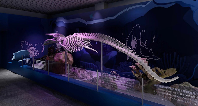在知识传递上,展览既揭秘鲸类“二次入海”的演化史诗——从5500万年前四足的巴基鲸,到完全水生的龙王鲸,通过进化转盘、翻板墙等互动装置,让千万年演化历程触手可及;也呈现“一鲸落,万物生”的生态奇迹,以四阶段场景置景与标本,展现鲸尸如何滋养深海万千生物,形成持续百年的生态循环;更聚焦鲸类保护现状,通过全球洄游路线感应灯箱、气柱识鲸互动、保护计数器等,呼吁公众参与海洋守护。