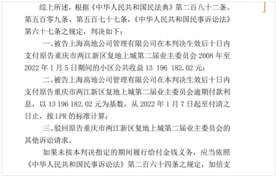 具体来看,判决结果包括被告上海高地公司管理有限公司(简称“高地公司”)须在判决生效十日内,支付原告重庆两江新区复地上城第二届业委会2008年至2022年1月5日期间的小区公共收益共计共约1319.62万元,包括停车费、广告费、场地租赁费等多项收入。同时要求支付逾期利息损失,并承担案件相关费用。