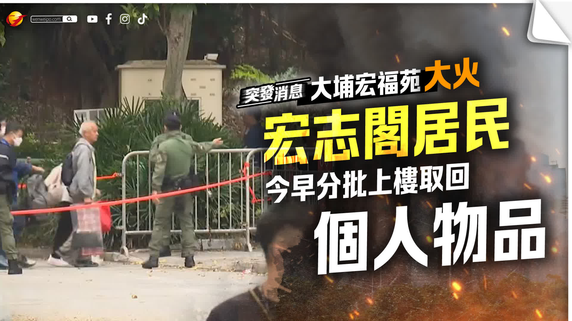 香港文匯報記者現場所見,有居民從家中執拾多個紅白藍尼龍的物品離開,除了個人物品外,連洗衣機等大型家電也搬走,幸得在場的政府應急隊人員協助搬運上車。宏志閣居民張小姐表示,今日返家主要是取回出世紙等重要證件,希望可以快些返屋企...」另有男居民指,初步單位未有受火警影響。