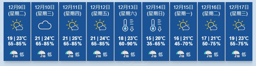 展望明日大致多雲。隨後一兩日天色較為明朗。周六北風增強,有一兩陣雨,晚上氣溫顯著下降。下周初最低氣溫在15、16度左右。