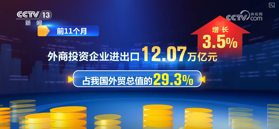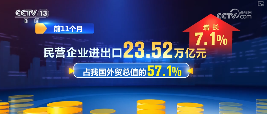 前11个月,民营企业进出口23.52万亿元,增长7.1%,占我国外贸总值的57.1%;外商投资企业进出口12.07万亿元,增长3.5%,占我国外贸总值的29.3%。