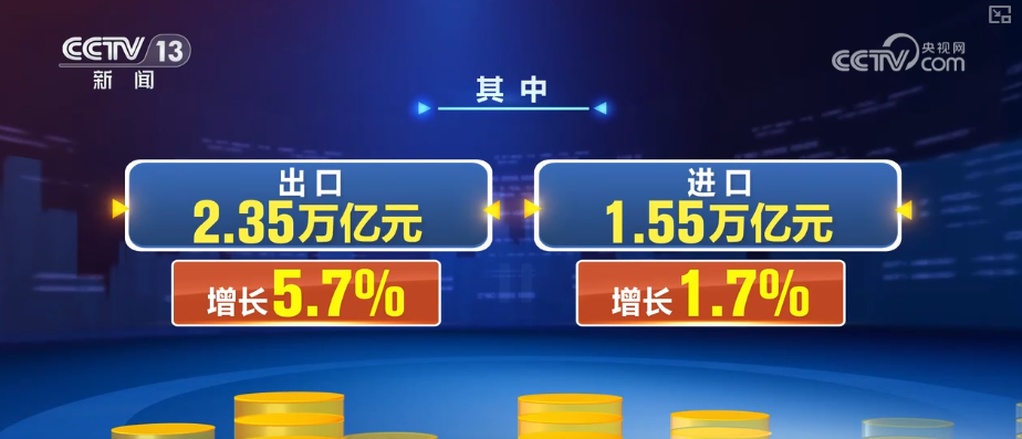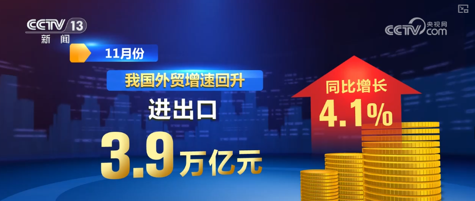 11月份,我国外贸增速回升,进出口3.9万亿元,同比增长4.1%。其中,出口2.35万亿元,增长5.7%;进口1.55万亿元,增长1.7%。