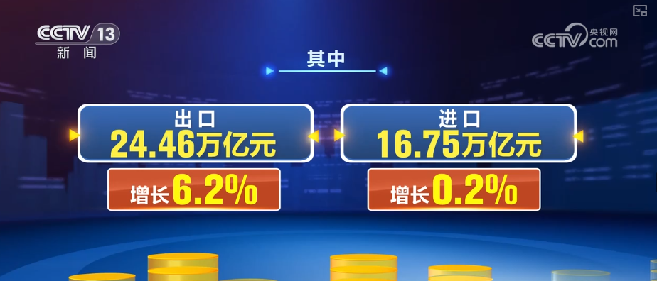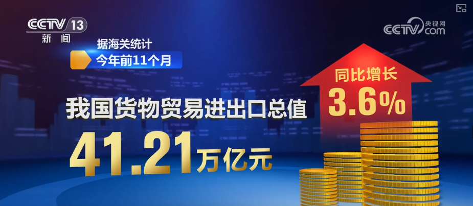 据海关统计,2025年前11个月,我国货物贸易进出口总值41.21万亿元,同比增长3.6%。其中,出口24.46万亿元,增长6.2%;进口16.75万亿元,增长0.2%。