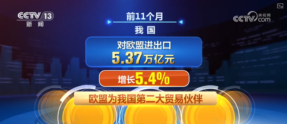 前11个月,我国对共建“一带一路”国家进出口21.33万亿元,增长6%,占我国外贸总值的51.8%。对东盟进出口6.82万亿元,增长8.5%,东盟继续保持我国第一大贸易伙伴。对欧盟进出口5.37万亿元,增长5.4%,欧盟为我国第二大贸易伙伴。