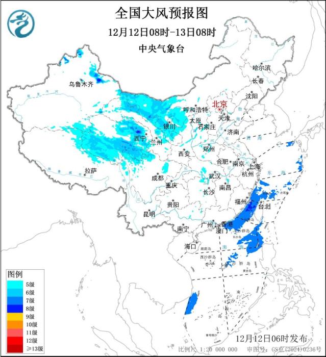 此外,12月12日08时至13日08时,新疆北部、青海、西藏北部、内蒙古西部、四川北部、甘肃东部、宁夏、陕西西北部等地部分地区有5~7级、阵风8~9级的大风,其中,新疆山口地区阵风可达10~11级;东海南部部分海域、台湾海峡、巴士海峡、南海东北部和中东部部分海域将有7级、阵风8~9级的大风。中央气象台12月12日06时继续发布大风蓝色预警。