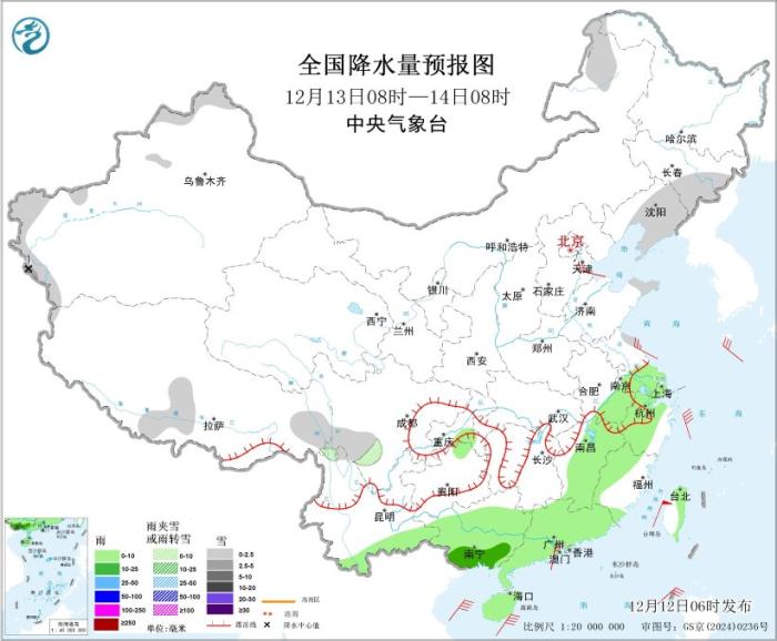 12月12日08时至13日08时,甘肃中部、内蒙古河套地区、陕西东部、山西、河北西部、北京西南部、河南、山东西南部等地部分地区有大雪,其中,山西西部、河南南部等地局地有暴雪(10~15毫米);重庆大部、湖北西南部、贵州东北部和东南部、湖南中南部、江西西部和南部、广东中北部、广西大部等地部分地区有中到大雨(25~45毫米)。新疆北部、青海、西藏北部、内蒙古西部、甘肃东部、宁夏、陕西西北部等地部分地区有5~7级、阵风8~9级的大风;东海南部部分海域、台湾海峡、南海东北部和中东部部分海域将有7级、阵风8~9级的大风。