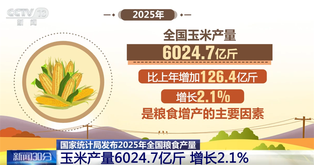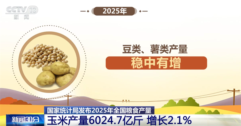 最新数据显示,2025年,全国粮食产量达到14297.5亿斤,比上年增加167.5亿斤,增长1.2%。其中,玉米、稻谷产量有所增加,小麦产量基本持平。2025年,全国玉米产量6024.7亿斤,比上年增加126.4亿斤,增长2.1%,是粮食增产的主要因素。豆类、薯类产量稳中有增。