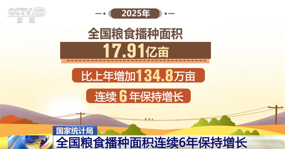 从播种面积看,2025年,全国粮食播种面积17.91亿亩,比上年增加134.8万亩,连续6年保持增长。其中,玉米面积增加较多,稻谷和小麦面积基本稳定,豆类和薯类面积略有下降。