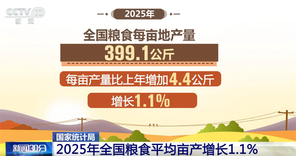 从粮食亩产看,2025年,全国粮食每亩地产量399.1公斤,每亩产量比上年增加4.4公斤,增长1.1%。