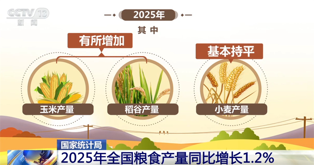 央视网消息:国家统计局12日发布最新的粮食数据显示,2025年全国粮食产量14298亿斤,比上年增长1.2%,实现丰收。