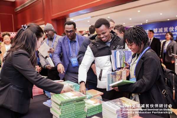 研讨会上,国际参会代表驻足中国减贫经验书籍展区