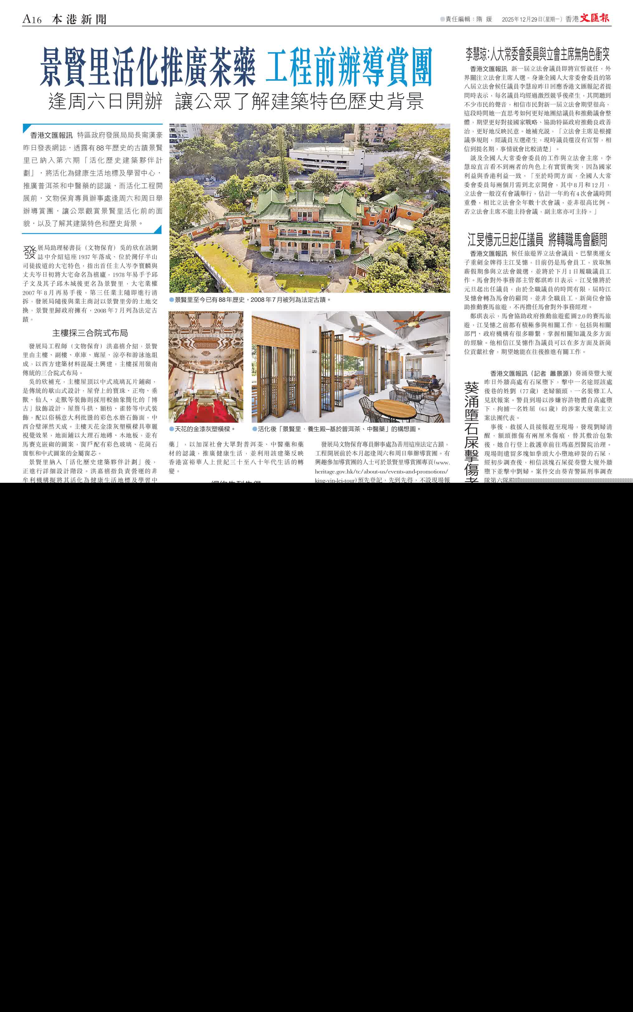 香港文匯報訊 特區政府發展局局長甯漢豪昨日發表網誌,透露有88年歷史的古蹟景賢里已納入第六期「活化歷史建築夥伴計劃」,將活化為健康生活地標及學習中心,推廣普洱茶和中醫藥的認識,而活化工程開展前,文物保育專員辦事處逢周六和周日舉辦導賞團,讓公眾觀賞景賢里活化前的面貌,以及了解其建築特色和歷史背景。