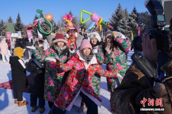 游客身着东北花袄体验冰雪欢乐。 于琨 摄