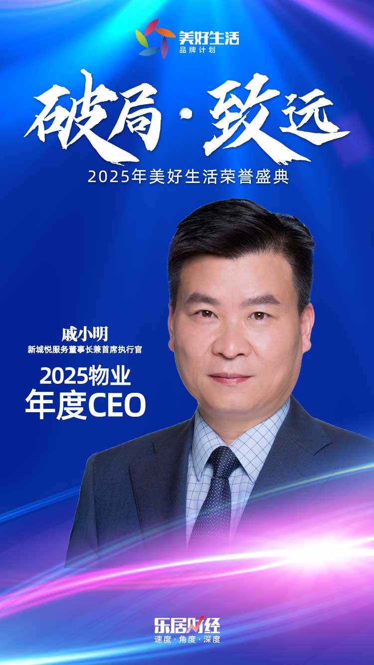 乐居财经 12月30日,由乐居财经主办的“破局·致远:2025年美好生活荣誉盛典”举行。新城悦服务董事长兼首席执行官戚小明荣获“2025物业年度CEO”。