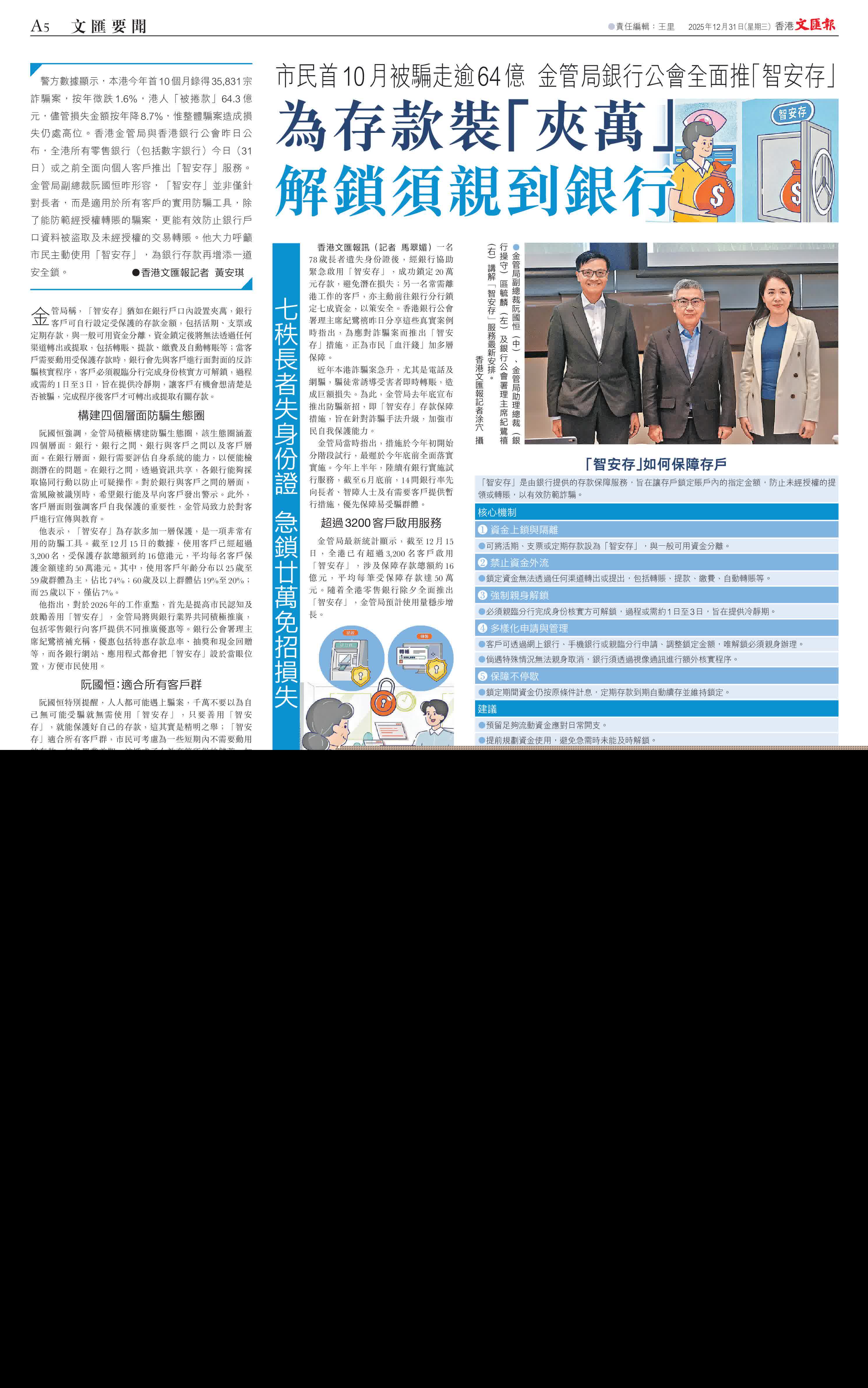 (香港文匯報記者 黃安琪)警方數據顯示,本港今年首10個月錄得35,831宗詐騙案,按年微跌1.6%,港人「被捲款」64.3億元,儘管損失金額按年降8.7%,惟整體騙案造成損失仍處高位。香港金管局與香港銀行公會昨日公布,全港所有零售銀行(包括數字銀行)今日(31日)或之前全面向個人客戶推出「智安存」服務。金管局副總裁阮國恒昨形容,「智安存」並非僅針對長者,而是適用於所有客戶的實用防騙工具,除了能防範經授權轉賬的騙案,更能有效防止銀行戶口資料被盜取及未經授權的交易轉賬。他大力呼籲市民主動使用「智安存」,為銀行存款再增添一道安全鎖。