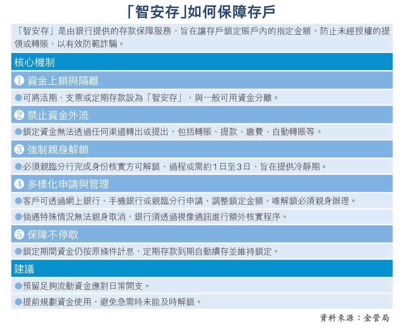 金管局稱,「智安存」猶如在銀行戶口內設置夾萬,銀行客戶可自行設定受保護的存款金額,包括活期、支票或定期存款,與一般可用資金分離,資金鎖定後將無法透過任何渠道轉出或提取,包括轉賬、提款、繳費及自動轉賬等;當客戶需要動用受保護存款時,銀行會先與客戶進行面對面的反詐騙核實程序,客戶必須親臨分行完成身份核實方可解鎖,過程或需約1日至3日,旨在提供冷靜期,讓客戶有機會想清楚是否被騙,完成程序後客戶才可轉出或提取有關存款。