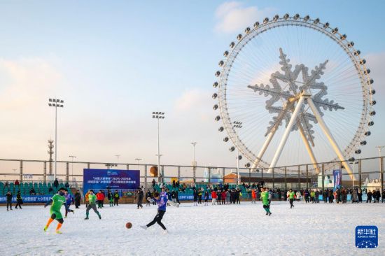 2025年12月20日,参赛球员在哈尔滨冰雪大世界参加大众雪地足球挑战赛。