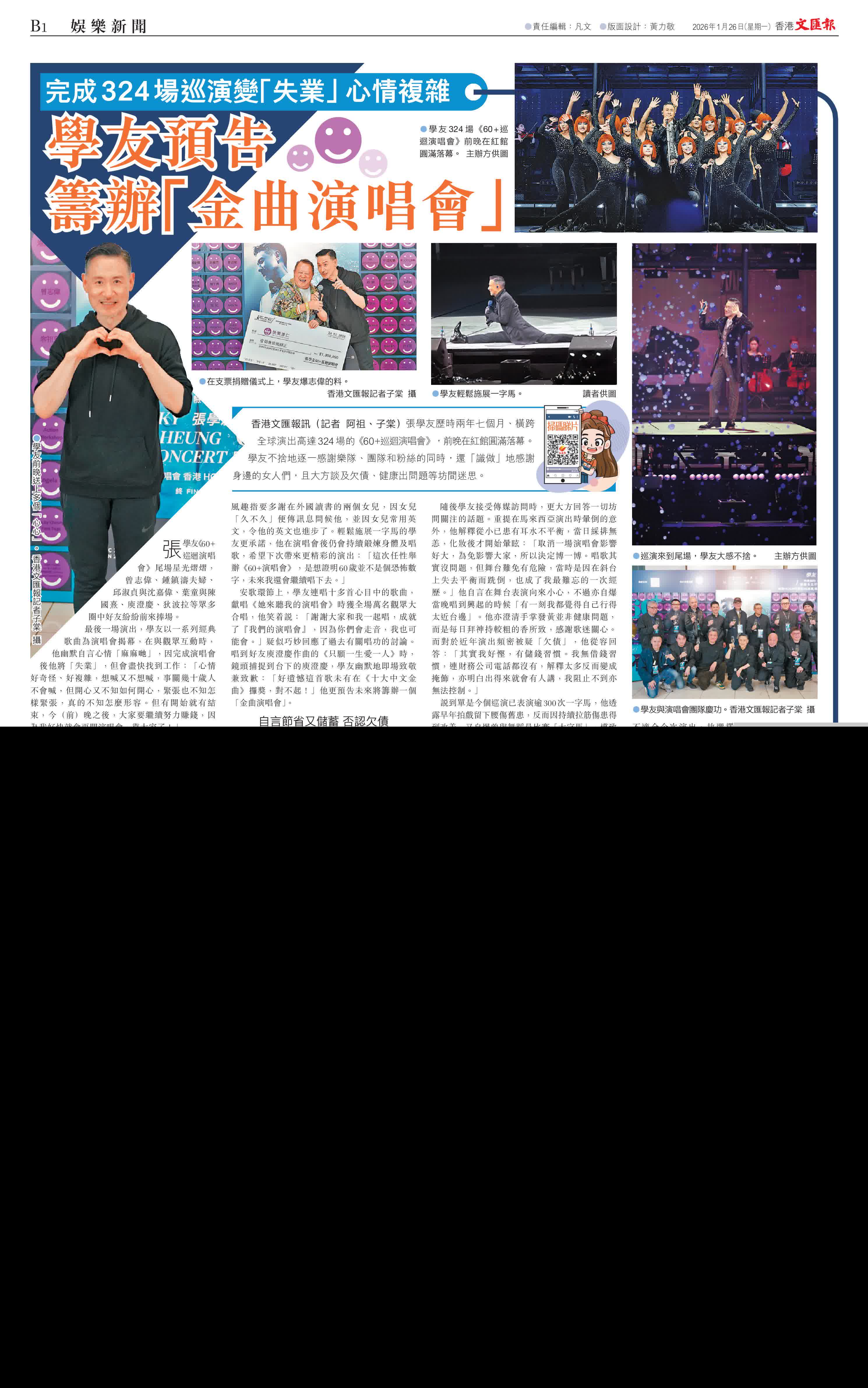香港文匯報訊(記者 阿祖、子棠)張學友歷時兩年七個月、橫跨全球演出高達324場的《60+巡迴演唱會》,前晚在紅館圓滿落幕。學友不捨地逐一感謝樂隊、團隊和粉絲的同時,還「識做」地感謝身邊的女人們,且大方談及欠債、健康出問題等坊間迷思。