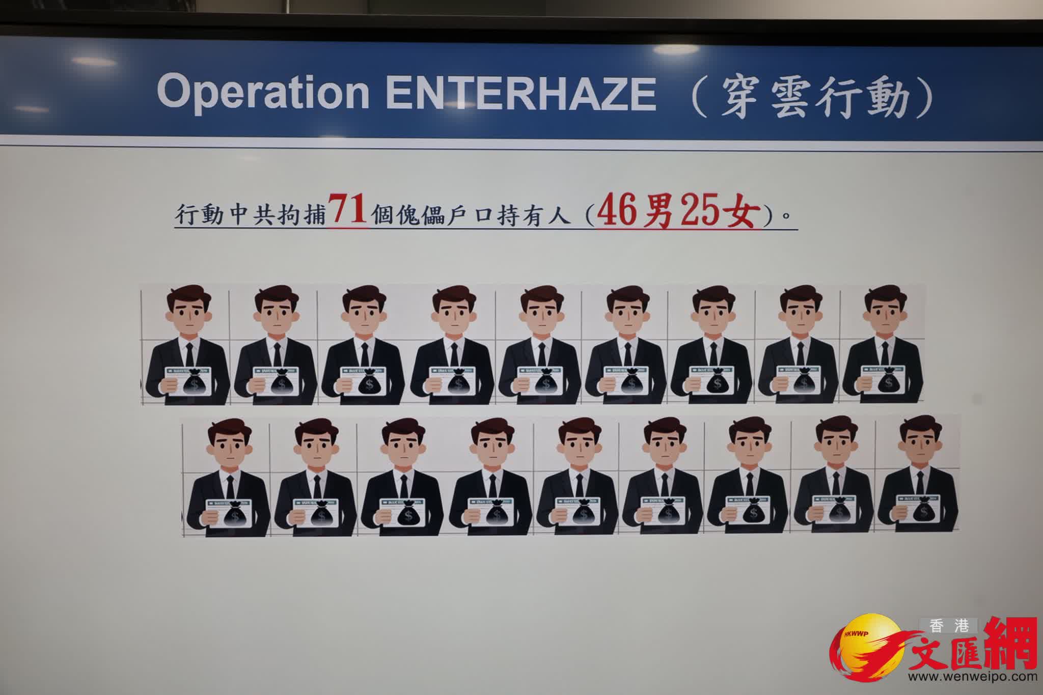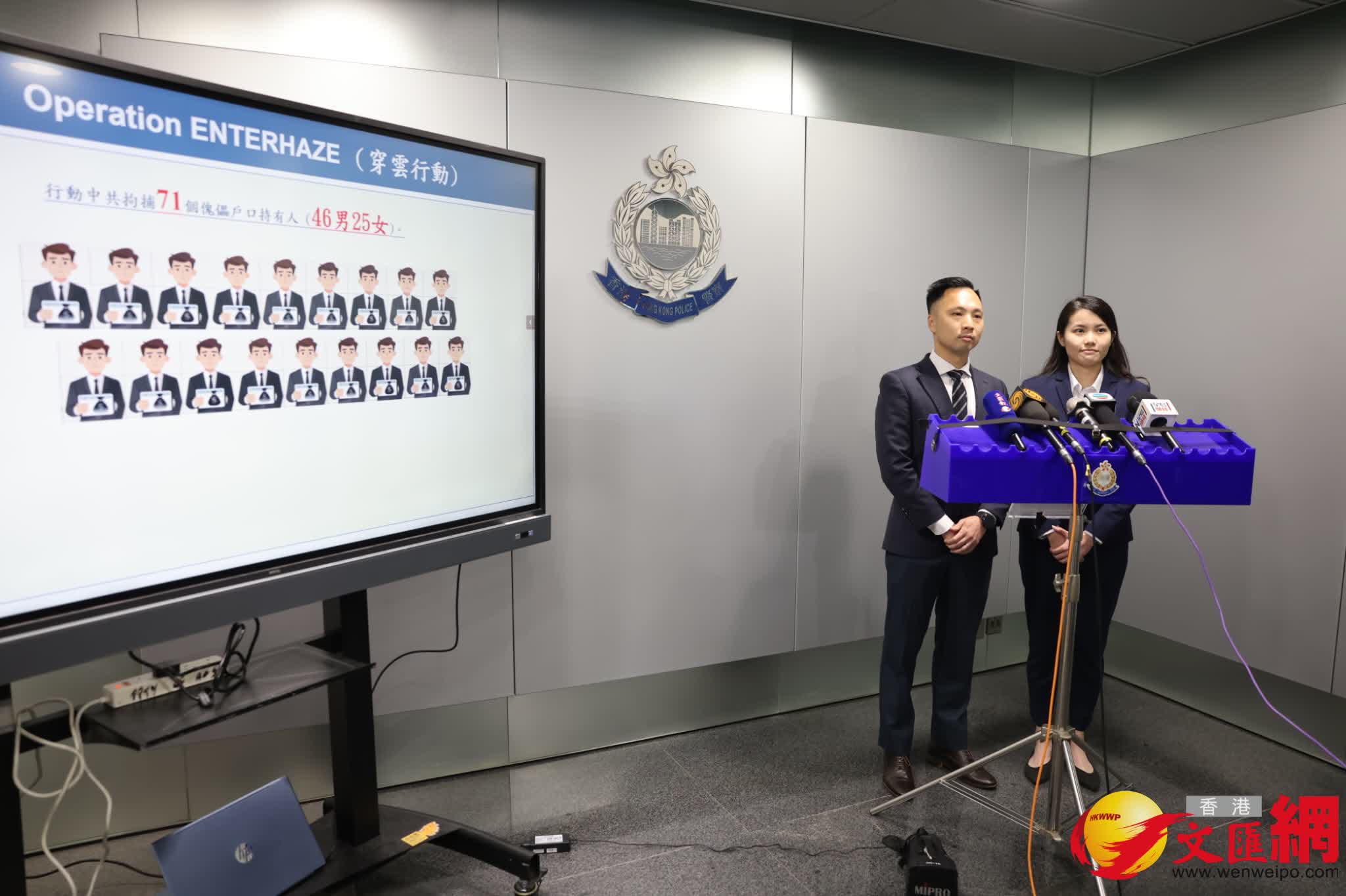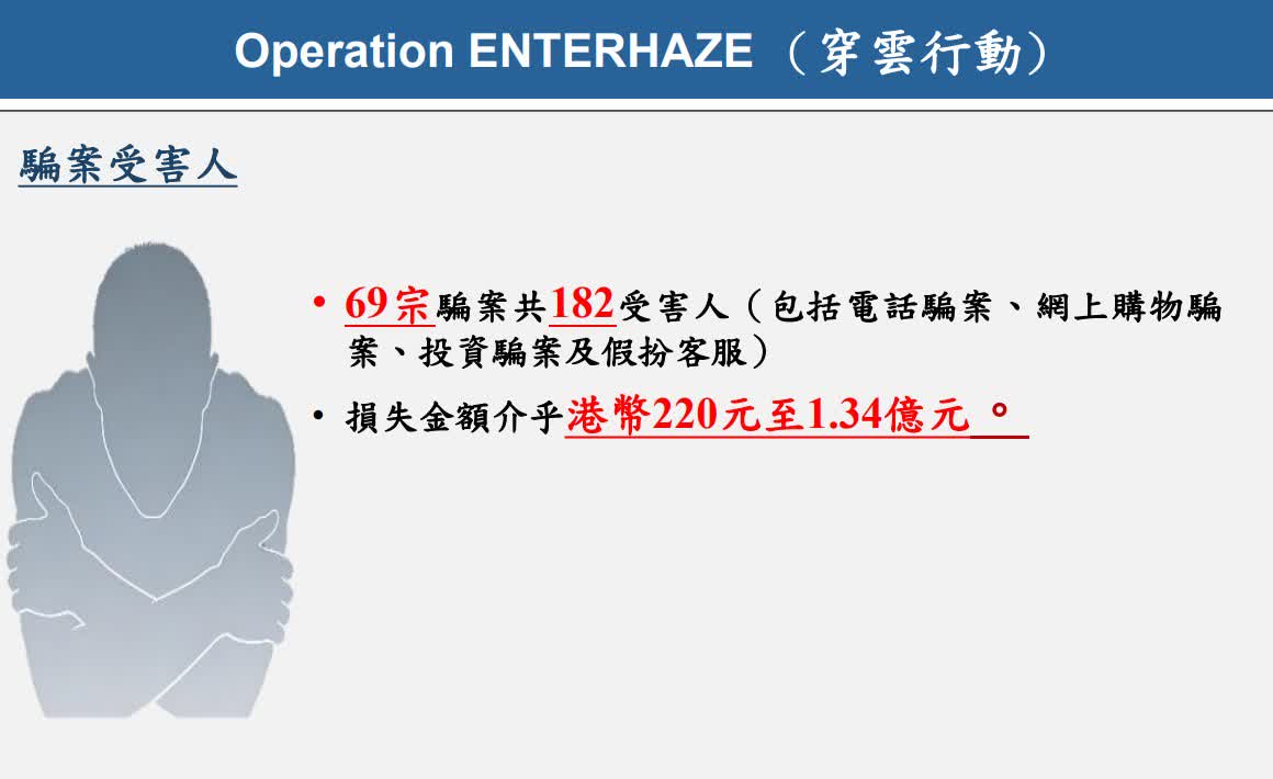 被捕71人,分別46男25女,年齡介乎14歲至65歲,報稱職業包括學生、家庭主婦、地盤工人及保安等,案中角色為傀儡戶口持有人,涉嫌「洗黑錢」罪名。被捕人所涉69宗騙案及相關洗黑錢案中,182名受害人年齡介乎18歲至68歲,涵蓋不同社會背景,包括部分高收入及高學歷人士,包括律師、牙醫及文員等行業,損失金額由220元至1.34億元不等。