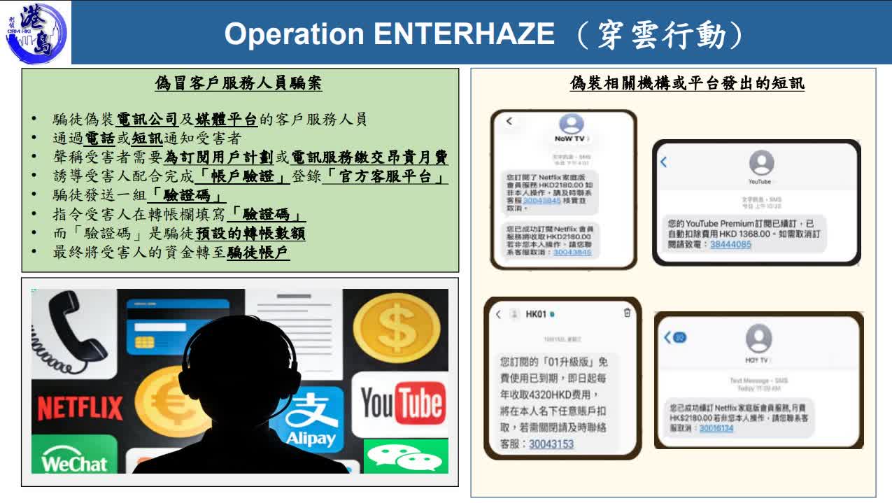港島總區科技及財富罪案組1B隊主管督察梁尉瑩表示,騙徒手法層出不窮,近期有不少市民誤墮「偽冒客戶服務人員」騙案,騙徒會偽裝成電訊公司及媒體平台等的客戶服務人員,通過電話或短訊通知受害者,聲稱市民已訂閱用戶計劃或收費電訊服務,而需要繳交昂貴月費。受害人面對突如其來「收費通知」變得緊張下,被騙徒有機可乘,以「協助取消誤訂服務、避免持續扣費」為藉口,誘導市民配合完成「賬戶驗證」,要求市民登錄所謂「官方客服平台」;同時以「身份核驗、確認賬戶」為由,索取受害人信用卡資訊及銀行賬戶資料。