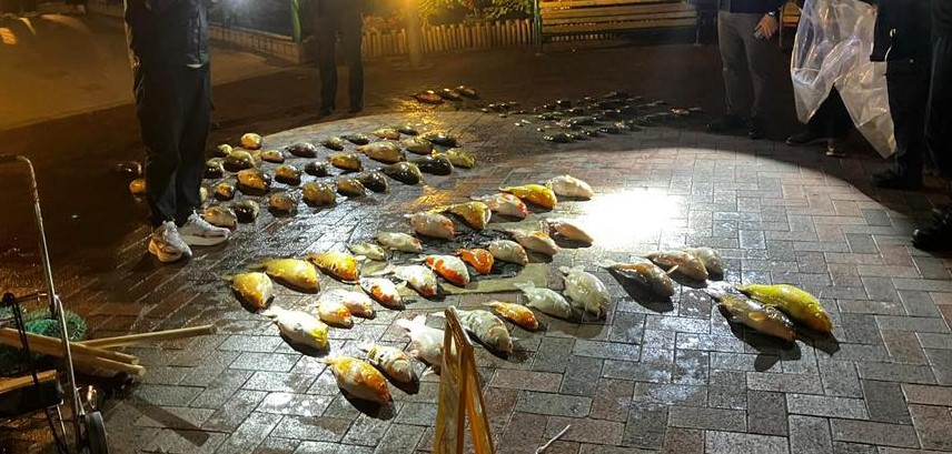 警員到場經調查發現大量死魚,愛護動物協會督察初步證實共有114條魚死亡,懷疑曾被人不恰當對待,但清潔公司職員已收工離開,列作殘酷對待動物案處理,交由將軍澳警區重案組第一隊(動物專隊)跟進,正通緝外判清潔公司6名涉案男女職員。