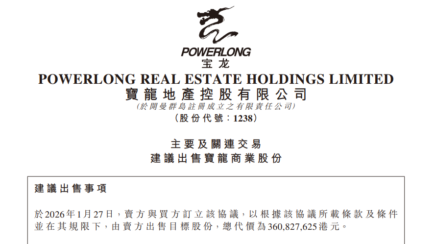 乐居财经李兰1月27日,宝龙地产(01238.HK)发布公告,宣布拟以3.61亿港元向关联方出售宝龙商业25%股权,以改善集团流动性并支持重组及日常运营。