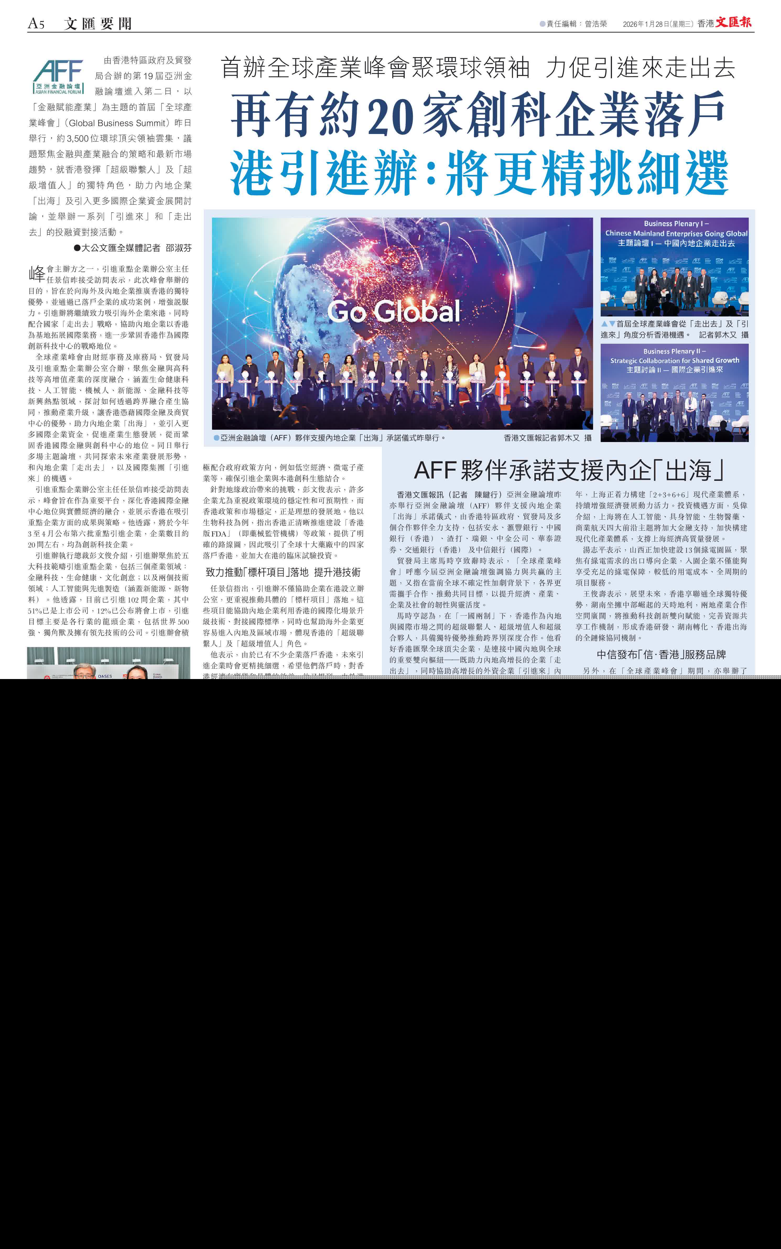 (大公文匯全媒體記者 邵淑芬)由香港特區政府及貿發局合辦的第19屆亞洲金融論壇進入第二日,以「金融賦能產業」為主題的首屆「全球產業峰會」(Global Business Summit)昨日舉行,約3,500位環球頂尖領袖雲集,議題聚焦金融與產業融合的策略和最新市場趨勢,就香港發揮「超級聯繫人」及「超級增值人」的獨特角色,助力內地企業「出海」及引入更多國際企業資金展開討論,並舉辦一系列「引進來」和「走出去」的投融資對接活動。