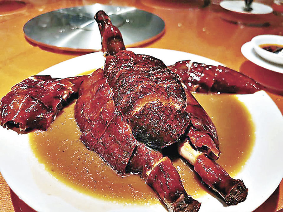 以及超「dope」甘棠燒鵝,選用鵝身飽滿的黑鬃鵝,皮殼夠厚,使燒出來賣相、脆度更好。燒鵝賣相極佳,鵝頸高昂,如同展翅欲飛,上桌前淋上秘製醬汁,外皮油潤光澤,令人垂涎欲滴。一口咬落去,鵝皮酥脆到有咔嚓聲,鵝肉醃得超入味,還有肉汁爆出,就連胸口的肉都不柴,可見廚師功底。
